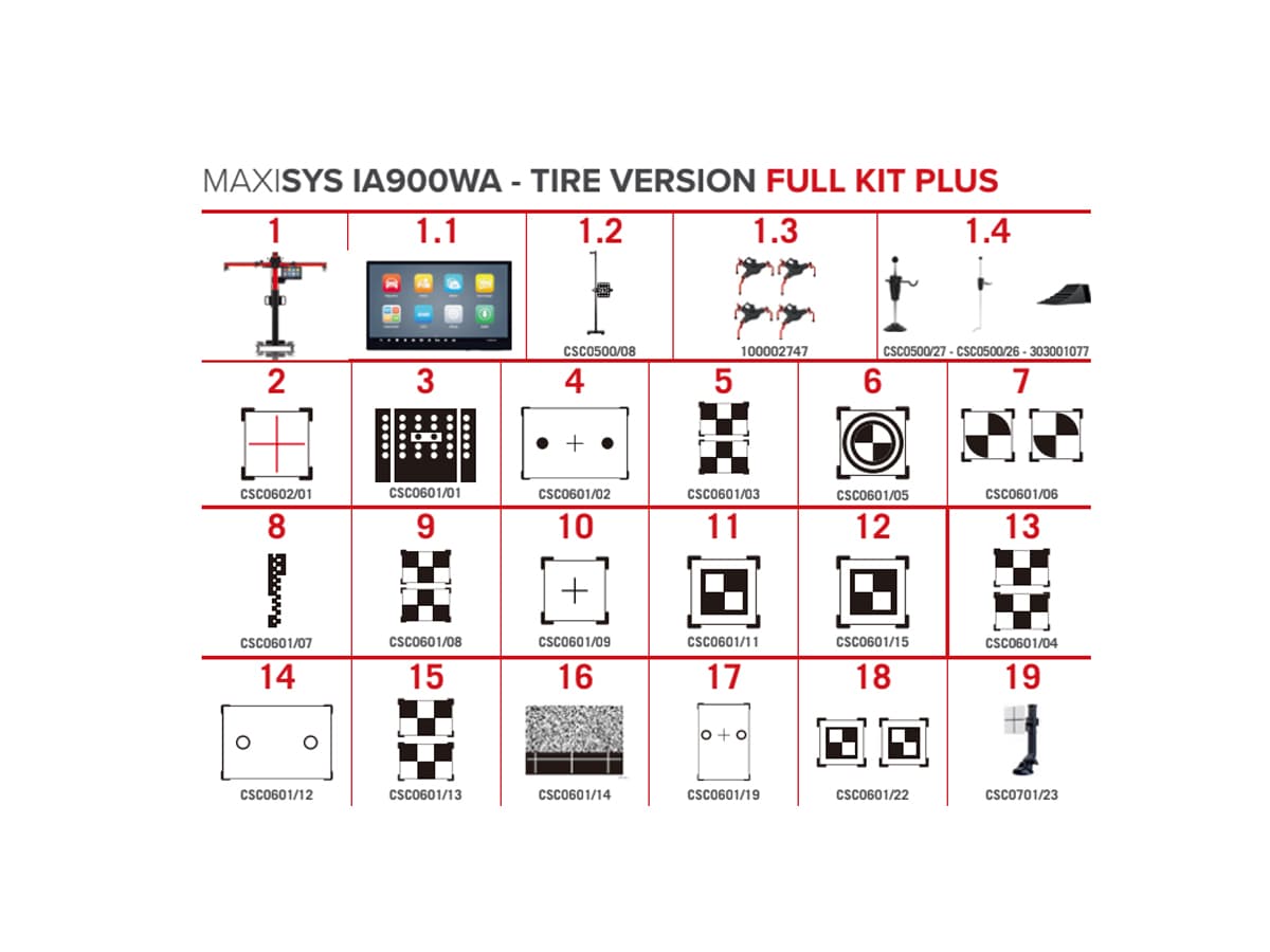 The IA900WA Full Kit Plus with tire clamps is the most complete version of this system. Whereas the Basic Kit is ideal for standard calibrations, the Full Kit Plus provides everything needed to calibrate virtually all modern ADAS systems, including additional targets and accessories for professional applications.